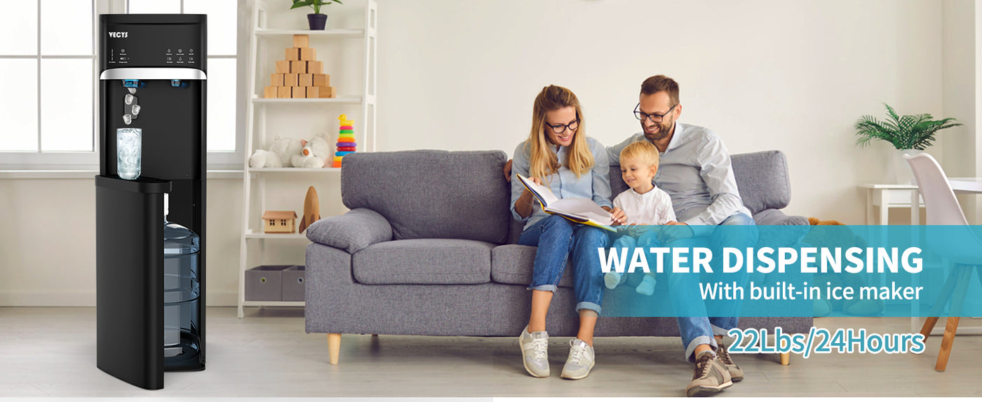 The VECYS Bottom Loading Water Dispenser with Ice Maker produces up to 22 pounds of ice per day.